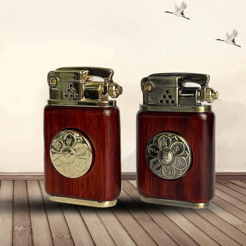 Họa tiết hình tròn ở giữa bật lửa được chạm khắc tinh xảo, có thể là biểu tượng Phật giáo hoặc phong thủy, với các ký tự hoặc hình ảnh có ý nghĩa bảo vệ và may mắn.