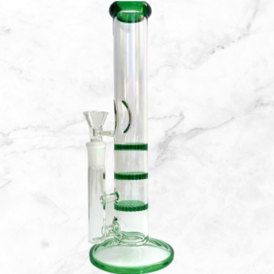 Sản phẩm được làm từ chất liệu thủy tinh dày dặn, mang lại sự bền bỉ và an toàn trong quá trình sử dụng. Phần thân của boong được trang trí bởi ba vòng màu xanh dương, tạo nên điểm nhấn tinh tế. Đế của boong cũng được viền xanh, làm cho tổng thể thiết kế trở nên đồng bộ và bắt mắt. Phần bowl và downstem đều làm từ thủy tinh trong suốt, thiết kế tối ưu để dễ tháo rời, vệ sinh hoặc thay thế khi cần.