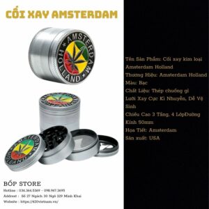 - Grinder “Amsterdam”: Chất liệu nhôm cao cấp, lưỡi xay sắc bén giúp thuốc lá sợi được nghiền mịn, đảm bảo giữ nguyên hương vị và chất lượng. Họa tiết cờ Rasta đặc trưng, đậm chất “Amsterdam”.