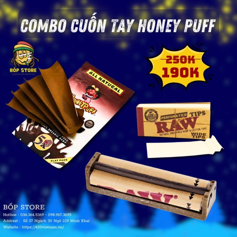 - Bộ combo cuốn tay Honey Puff bao gồm giấy cuốn Honey Puff chất lượng cao và tips cuốn RAW đa dạng kích cỡ, giúp bạn tự do sáng tạo những điếu thuốc thơm ngon, êm dịu.
